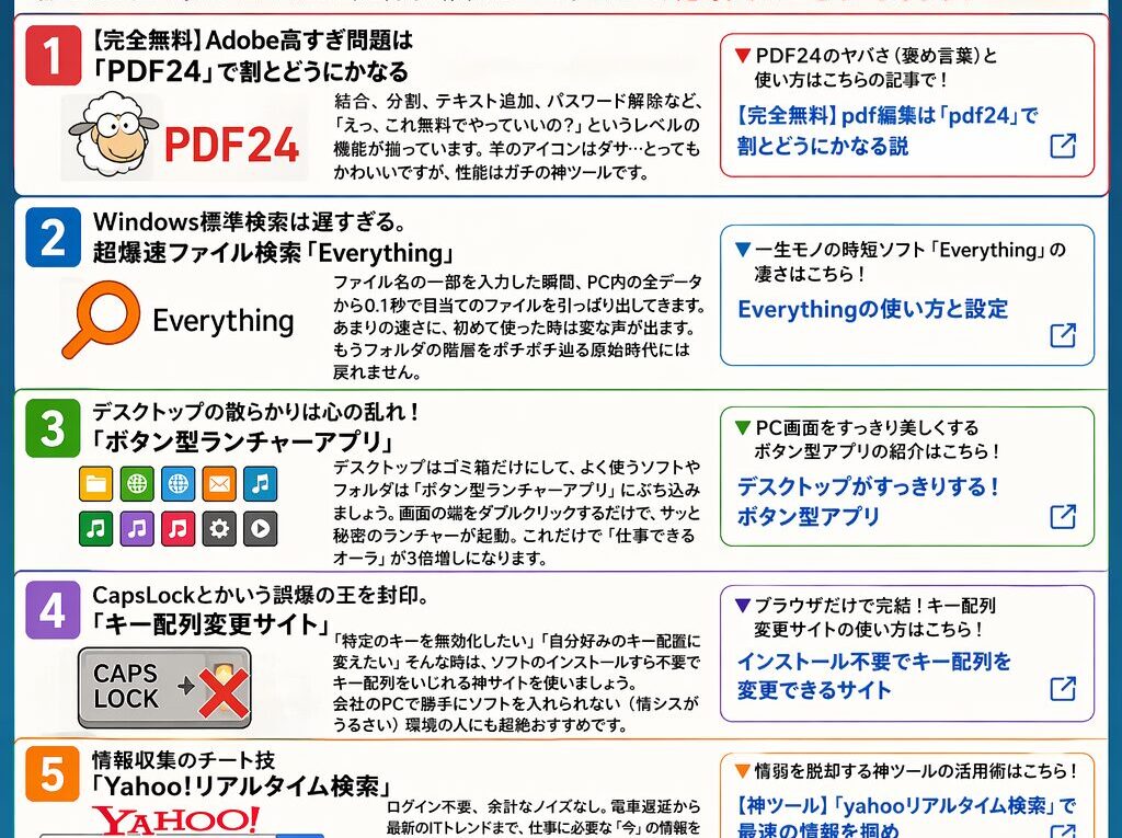 AI (7) AIスクリーニング (2) AI応答 (2) Ai音声入力 (2) android (1) Apple (1) cmd (7) Gemini (2) GoFullPage (2) Google (2) Google AI Studio (2) IDECO (6) iPhone (3) Mac (5) NISA (7) OS (1) pixel (1) Windows (6) お金 (2) まこなり社長 (1) アウトプット (3) インターネット接続 (2) オーディブル (2) ガソリン (1) キー配列 (1) コスパ (86) コピペ (5) コマンドプロンプト (7) ショートカット (2) シンプリスト (3) シンプル (1) ジモティー (1) スクリーンショット (2) スマホ (2) スマート (1) スローライフ (1) テンプレ (2) デスクトップ (1) ノートパソコン (1) パソコン (1) ブラックボックス (2) ペット保険 (1) ホワイトニング (2) マニュアル (1) マニュアル化 (2) ミニマリスト (6) メモ (3) メルカリ (1) メール (2) ユニクロ (3) ライフハック (99) ラクマ (1) ルーティン (2) 上司 (2) 乗り換え (1) 仕事 (73) 仕組み (1) 保険 (1) 判断 (1) 効率化 (85) 勉強 (2) 報連相 (1) 大谷翔平 (1) 完璧主義 (13) 役職者 (1) 投資 (5) 整理 (49) 整頓 (2) 旅行 (2) 時短 (57) 業務スピード (1) 業務改善 (55) 残業 (4) 燃費 (1) 猫 (2) 生活 (58) 知識 (2) 移住 (1) 積立 (1) 筋トレ (3) 節約 (5) 経験 (2) 美容 (1) 習慣化 (6) 職場 (2) 職場環境 (24) 脱毛 (2) 自動化 (1) 自己投資 (2) 記憶 (3) 記録 (2) 読書 (6) 貯金 (3) 資産運用 (4) 趣味 (2) 車 (2) 運動 (1) 集中 (2) 食費 (1) 0割共有 (1)