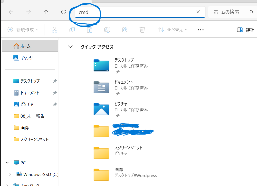 ステップ1:対象のフォルダを開き、アドレスバーに「cmd」と入力